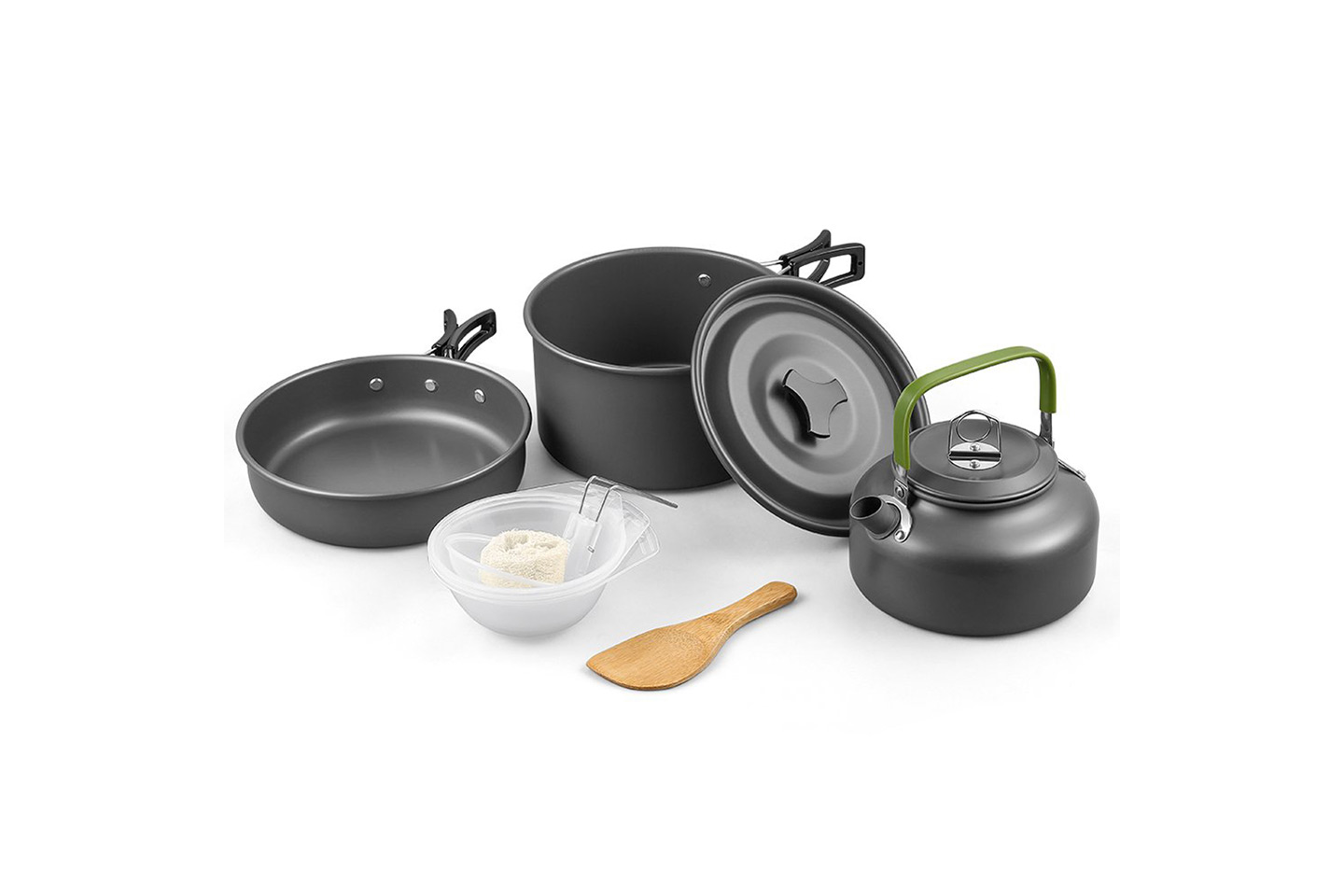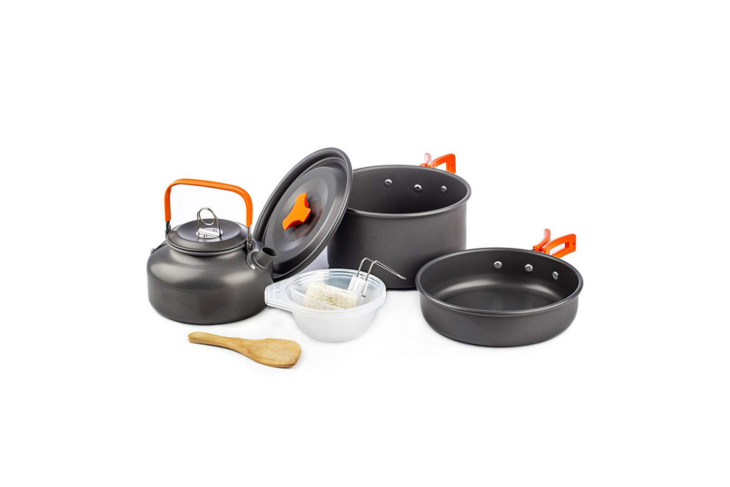 - Paketet innehåller: gryta med lock, stekpanna, tekanna med lock, dräneringsskål, träslev, tre soppskålar, rengöringssvamp och en förvaringspåse