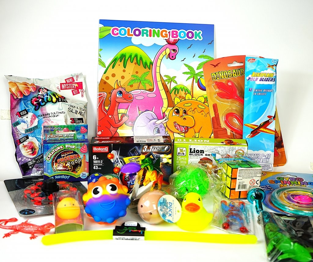 I paketet finns t.ex. Squishy, slime, fidgets, lera, byggsatser, dinosaurier och mycket mer, till ett värde på 946 kr!