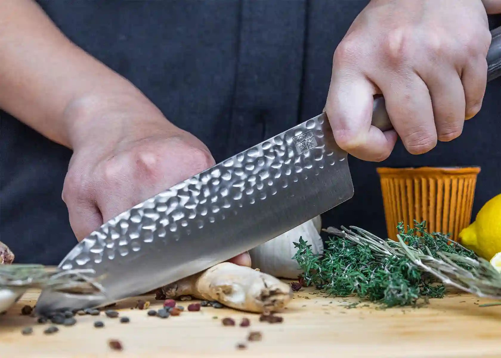Förutom dess estetiska dragningskraft skapar mönstret "Tsuchime" (槌目) (hamrat) små luftfickor mellan bladet och maten som skärs. Denna urgamla japanska metod minskar luftmotståndet, vilket förhindrar att mat fastnar på bladet.