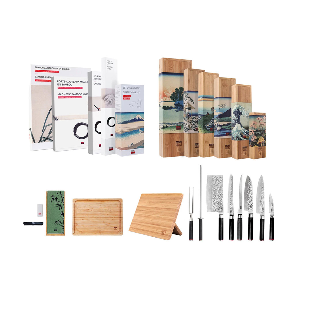 Uppgradera ditt kök med "The Complete Set Deluxe Edition" innehåller totalt 6 knivar, magnetisk knivhållare, slipset, skärbräda i bambu, slipstål och stekgaffel.