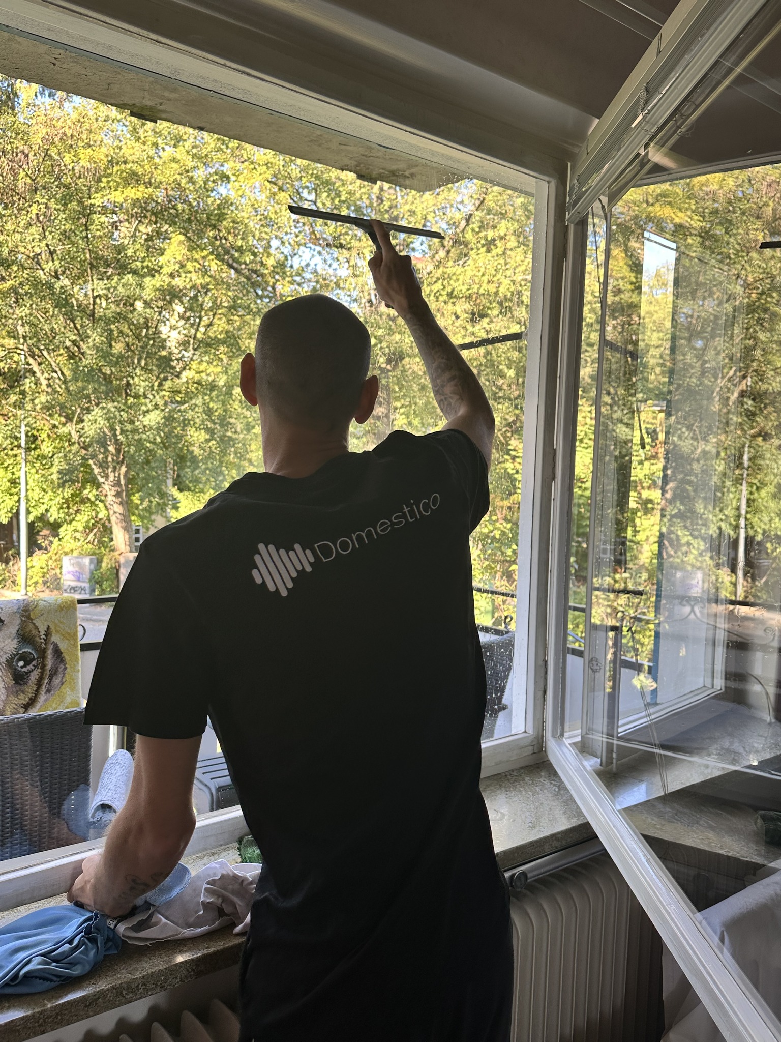 Inför fönsterputsningen förbereder du genom att flytta undan möbler, ta bort gardiner och tömma fönsterbrädor så att fönstren är lättåtkomliga. Domesticos team anländer utrustade med allt som behövs, miljövänliga medel, skrapor och trasor. De putsar fönstren noggrant på fyra sidor och lämnar dem klara, rena och fria från ränder. Vid behov kan du lägga till karmtvätt för att även rengöra bågar och ramar.