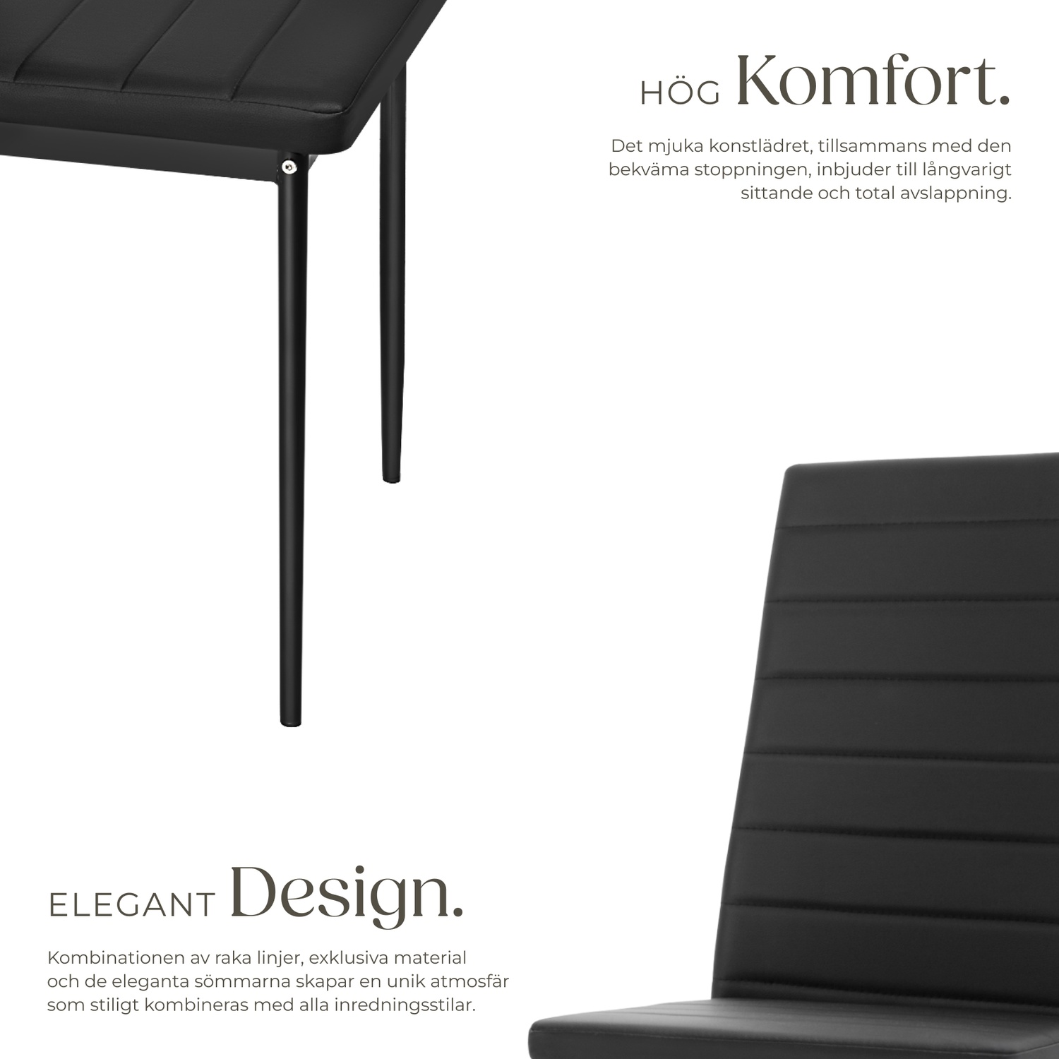 När det kommer till matstolar är komfort och stabilitet av yttersta vikt. Våra stolar erbjuder hög sittkomfort tack vare deras mjuka och bekväma stoppning tillsammans med en klädsel i robust konstläder. Designen gör stolarna lämpliga för alla hem, då de är lätta och enkla att flytta. Trots den lätta vikten är stolarna mycket robusta, tack vare de smala stålbenen som garanterar hög stabilitet. Dessutom är stolarna utrustade med skyddande plastkåpor på benen, vilket förhindrar repor och skador på dina golv och gör dem både funktionella och golvvänliga