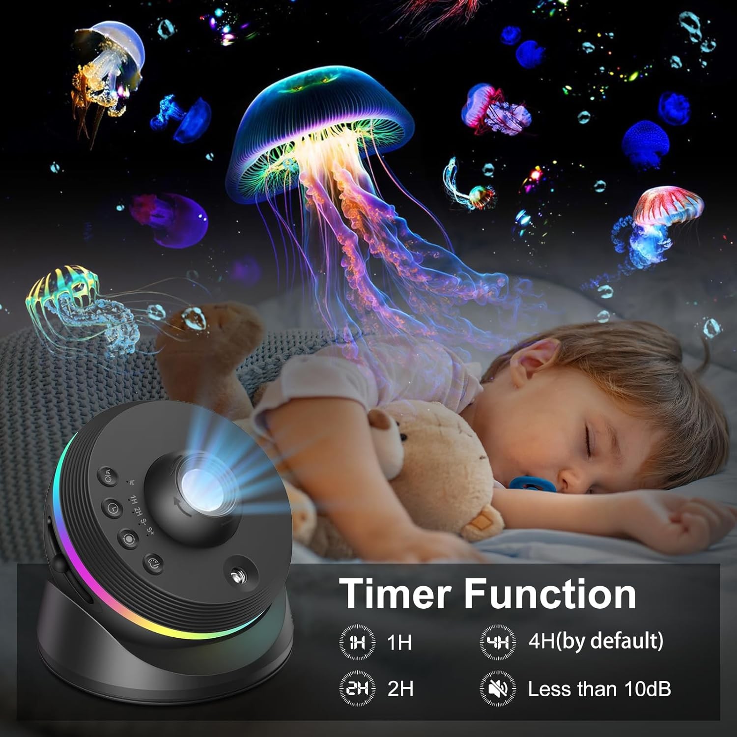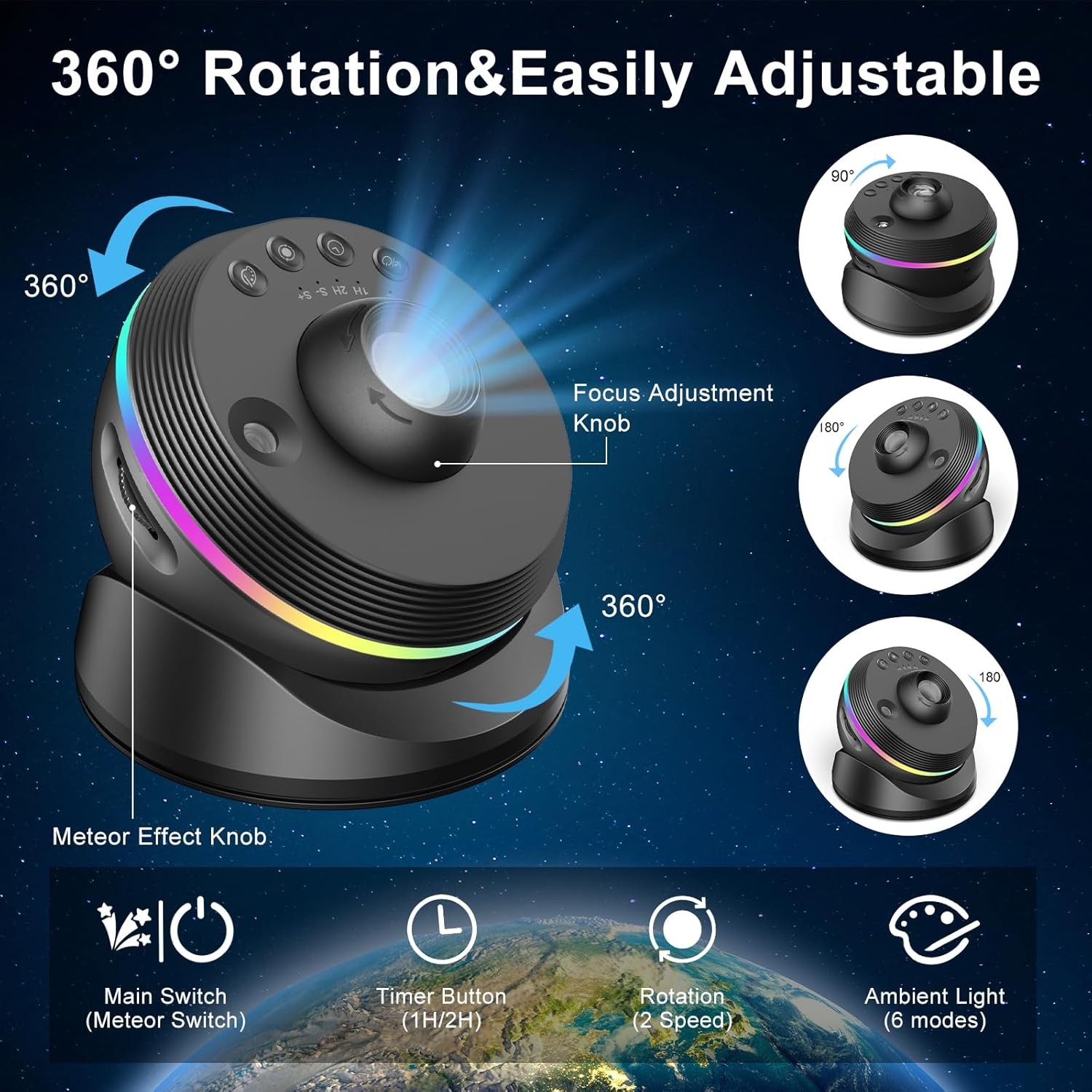 Upplev 13 unika rymdmotiv – från Vintergatan och Andromeda till solsystemet, nebulosor och rymdfenomen. Den tysta motorn, justerbara fokus och timerfunktion gör projektorn lämplig som nattlampa, avkopplingsljus eller dekorativ belysning.