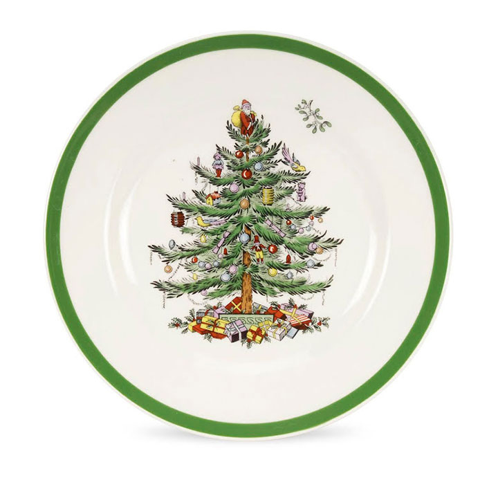 Vacker tallrik med detaljerat motiv med gran, julkulor, paket och andra fina detaljer. Servera dina favoritdesserter under julen på dessa tallrikar.