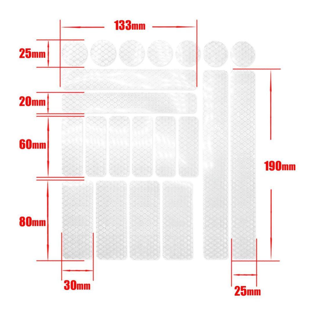 Starkt reflekterande klistermärken i olika mönster som får dig att synas bättre i mörkret. Förpackningen innehåller 21 st reflex-klisterlappar med 3M klister som fäster bra på alla hårda ytor och är