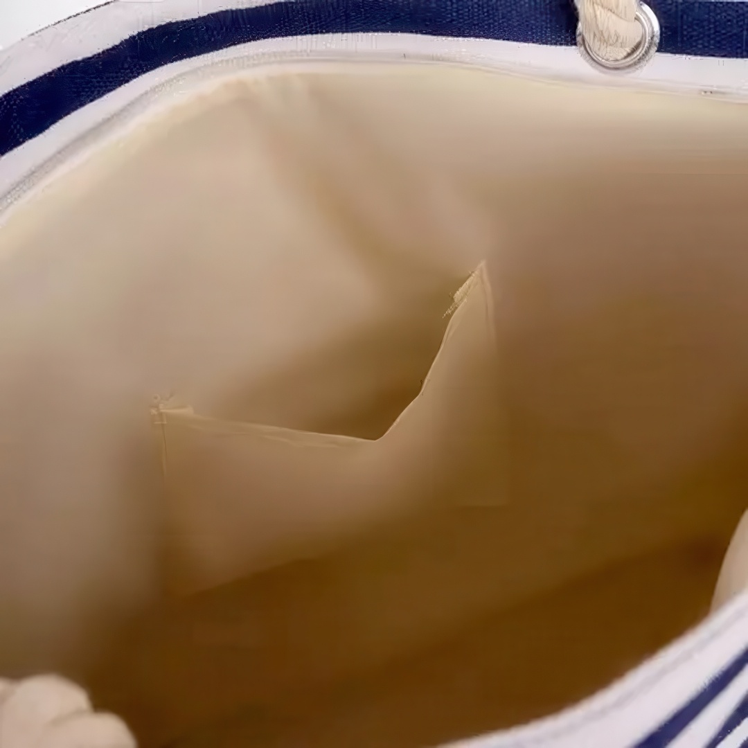 Den yttre dragkedjefickan håller dina värdesaker nära till hands, medan den medföljande mini-plånboken som fästs i axelremmen ger ett extra praktiskt förvaringsutrymme. Väskans klassiska färgkombination i marinblått och vitt, samt jute i botten, ger den en fräsch och somrig look – perfekt för stranden, staden eller gymmet.