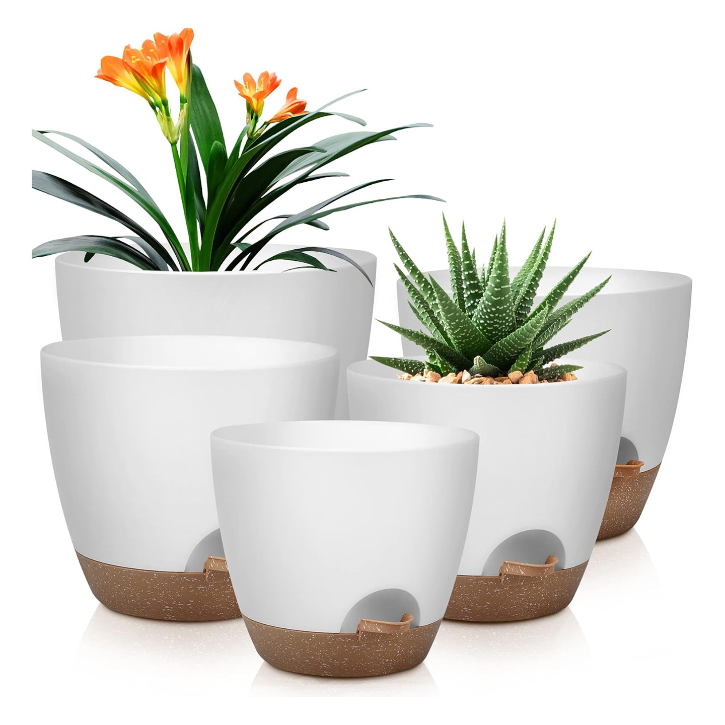 - 5 självvattnande blomkrukor i storlekar: 25, 23 och 20 cm