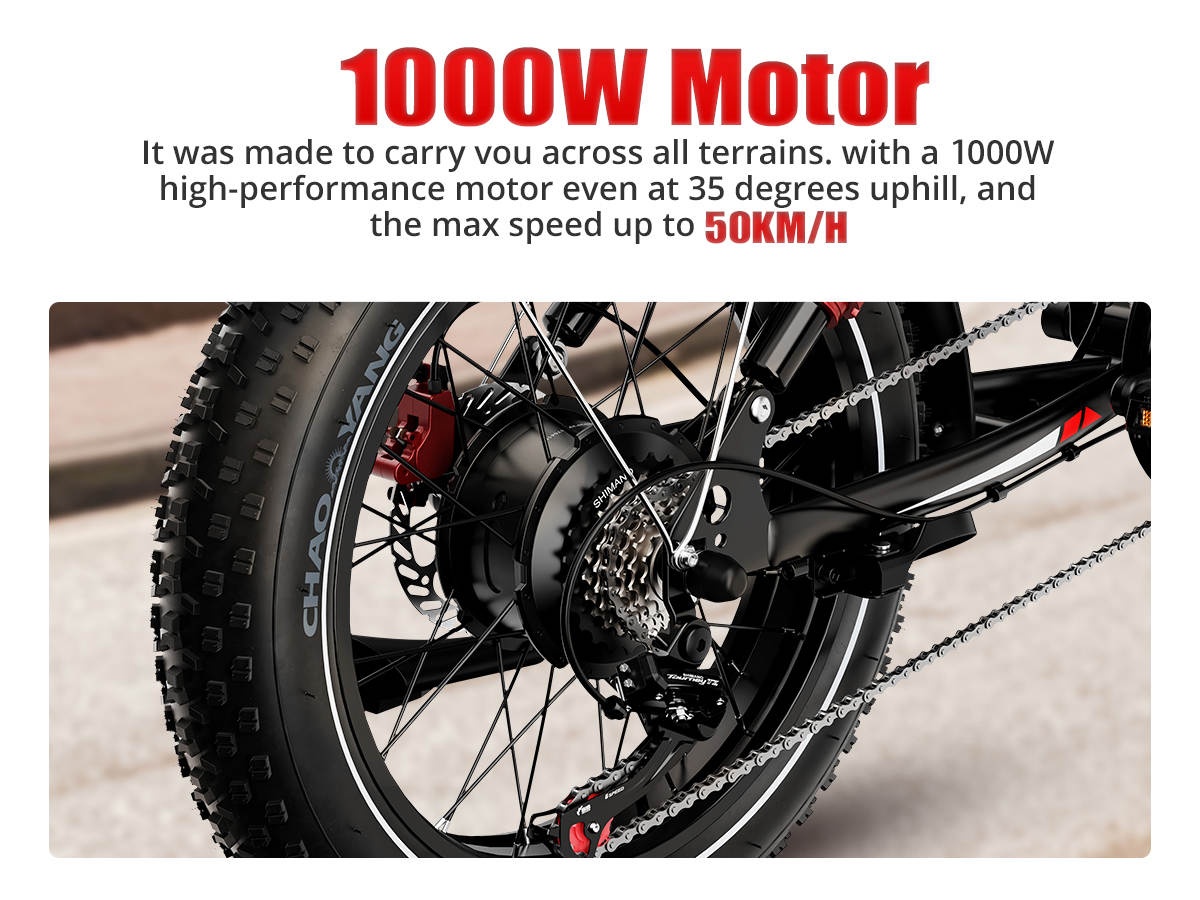 - Upplev Kraft och Hastighet: Ge dig ut på ett adrenalinladdat äventyr med vår avancerade elcykel för vuxna. Denna högpresterande modell är utrustad med en kraftfull 1000W motor. Känn friheten och spänningen med varje åktur, där varje väg blir en bana för obegränsad glädje.