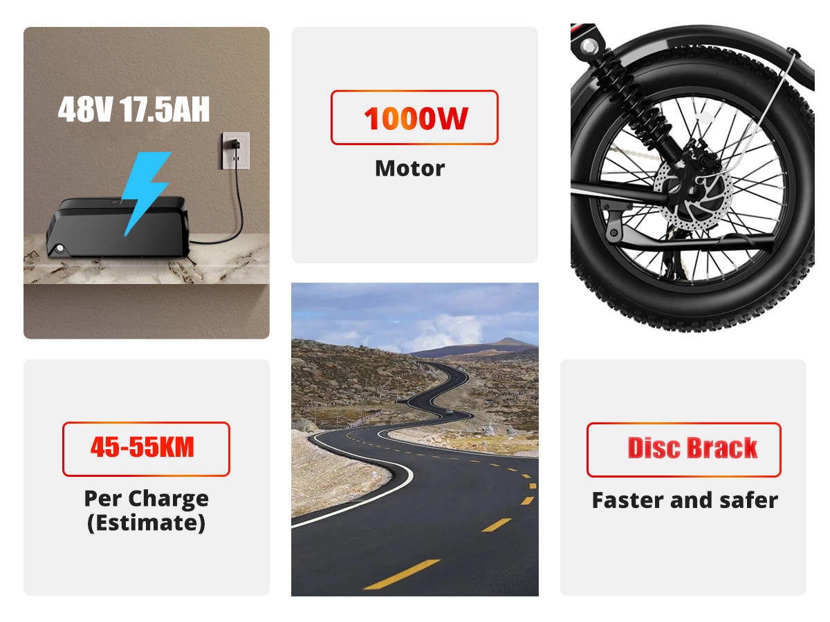 -Långdistansutforskning utan Gränser: Med ett avancerat 48V 17.5AH batteri tar vår elcykel dig längre än någonsin tidigare, med en imponerande räckvidd på upp till 45km per laddning. Glöm räckviddsångest; vårt effektiva system säkerställer att du snabbt är redo för nya äventyr med en laddningstid på endast 6-7 timmar.