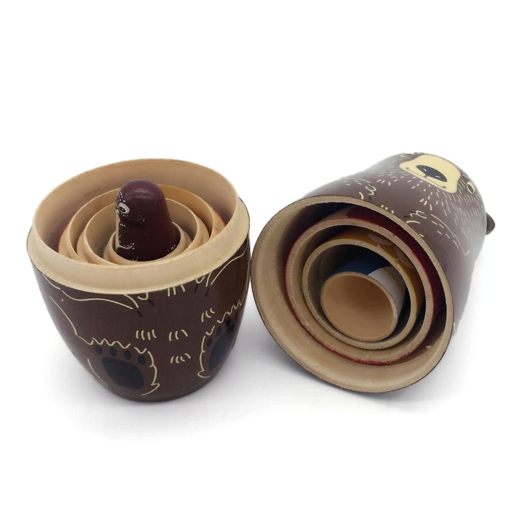 Handmålade ryska dockor i trä med skogsdjur som dekorativ inredning.