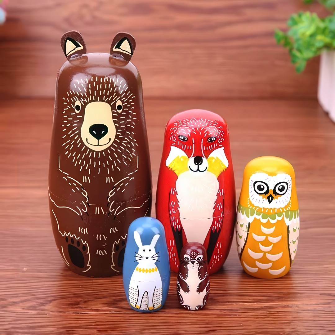 Dessa ryska dockor i trä är ett klassiskt hantverk som kombinerar tradition, detaljrikedom och naturinspiration. Varje docka är handmålad med motiv av skogsdjur och innehåller mindre dockor inuti, vilket skapar en både dekorativ och lekfull helhet som väcker intresse hos både stora och små.