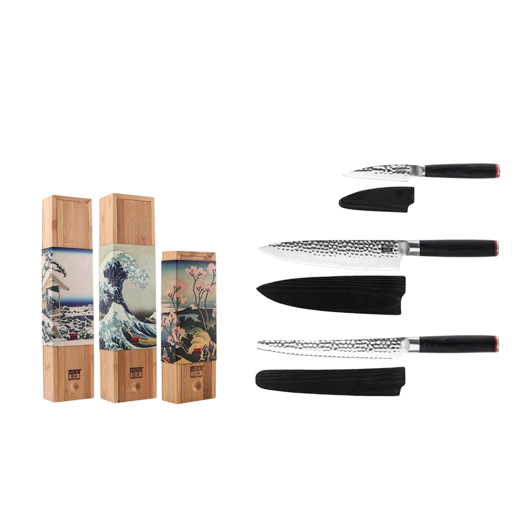 Kotai "The Essential" set innehåller: skalkniv hamrad kniv, Gyuto (kockkniv) hamrad kniv och brödkniv tandad hamrad kniv.
