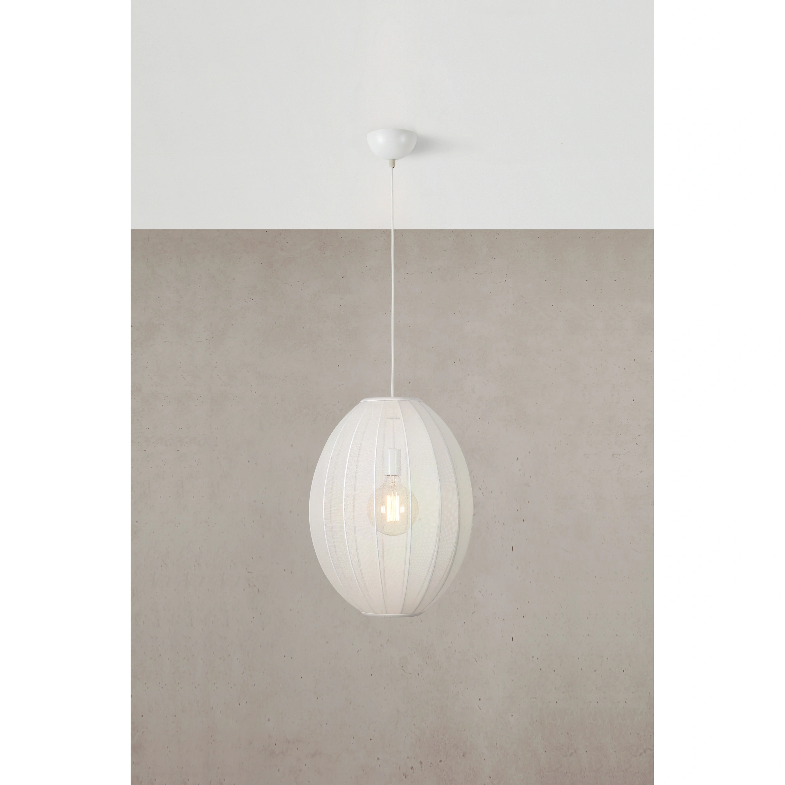 Stilren taklampa som kombinerar textil och metall i en modern och tidlös design. Lampan har en oval skärm i vit textil och matchande takkopp i svartlackerad metall. Med sin generösa diameter på 40 cm blir Florence ett effektfullt blickfång över exempelvis ett matbord, i vardagsrummet eller som en stilfull detalj i sovrummet. Den vita textilkabeln är 1,9 meter lång och lampan hängs enkelt upp med takkrok.