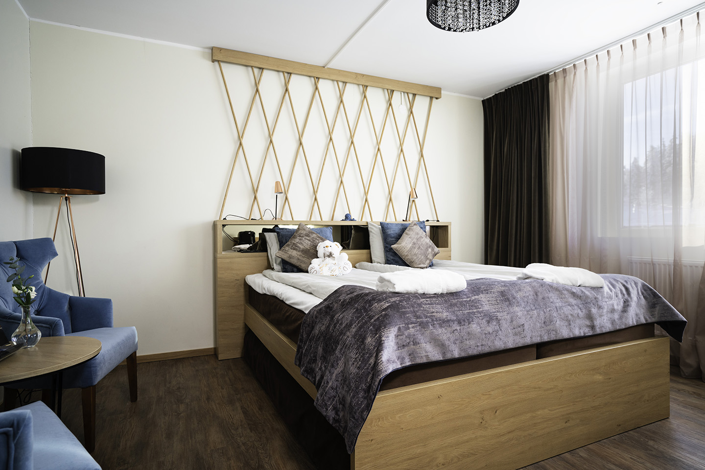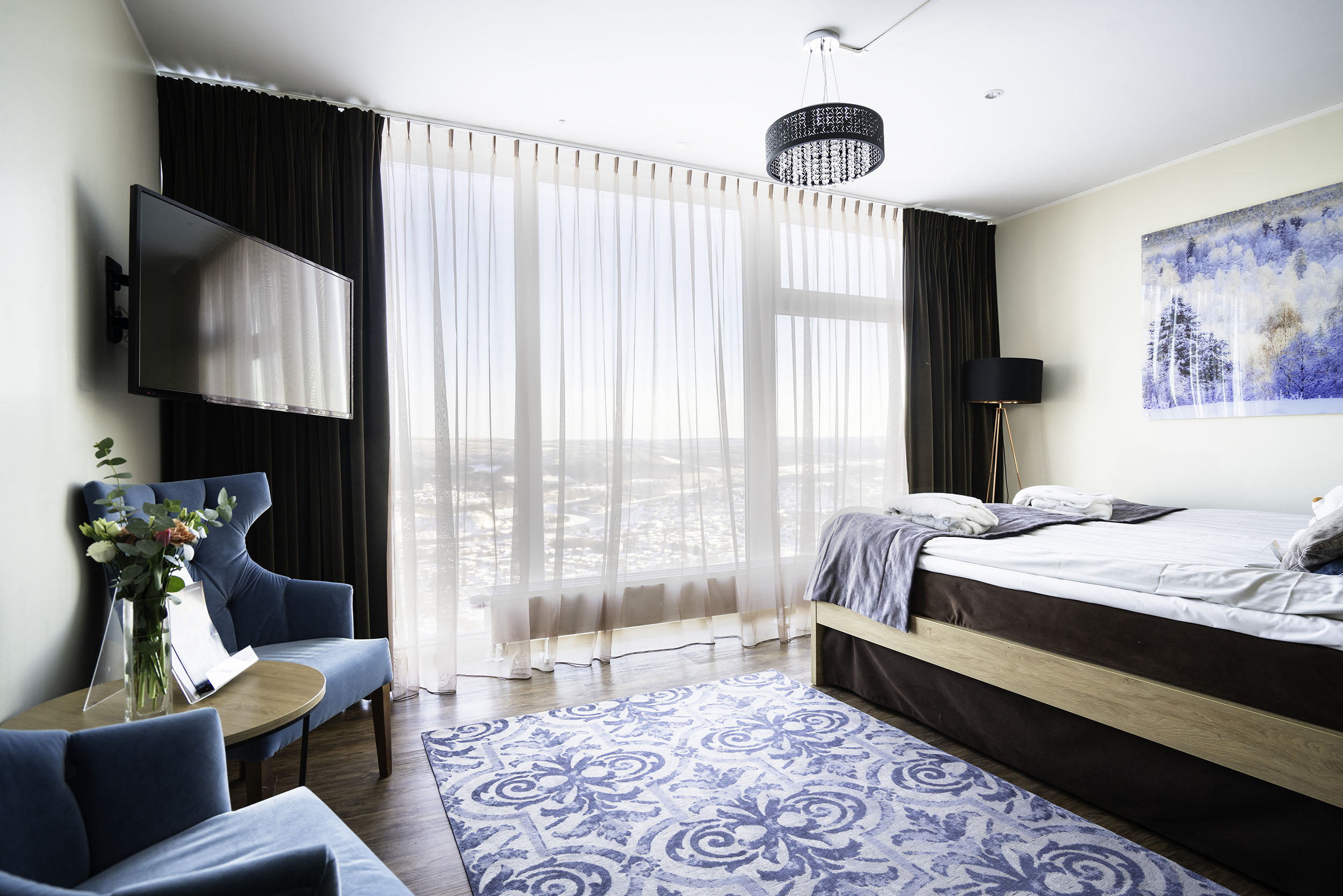 Ni bor i ett härligt Deluxe-rum där fönster från golv till tak ger en vidunderlig utsikt över Ångermanälven och Sollefteå stad. Som om inte det vore nog har ni egen bastu och generös minibar för bästa möjliga komfort.