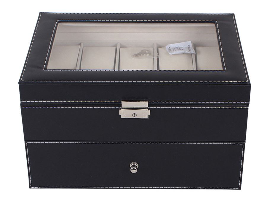 Perfekt förvaring för dig som har många klockor. Snygg finish i PU läder. Övre delen är låsbar med medföljande nyckel. Gångjärn för stabilare öppning och stängning.