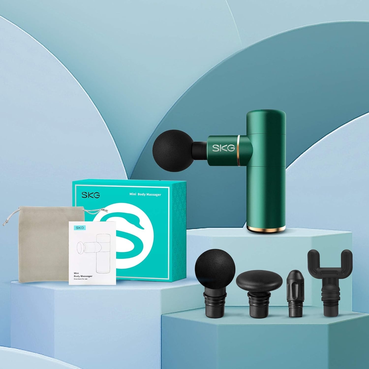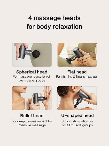 SKG F3 levereras med fyra professionella, utbytbara massagehuvuden för att passa olika muskelgrupper och massagebehov: