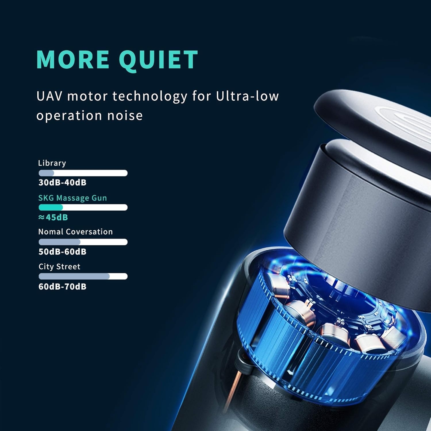 SKG F3 Massagepistol är designad för ultimat bekvämlighet och väger endast 495 gram. Den kompakta och bärbara utformningen gör den enkel att ta med och använda var som helst – hemma, på gymmet eller när du är på språng. Den avancerade UAV-motortekniken garanterar en tyst drift med ljudnivåer under 44 dB, så du kan njuta av en lugn massageupplevelse utan att störa andra.