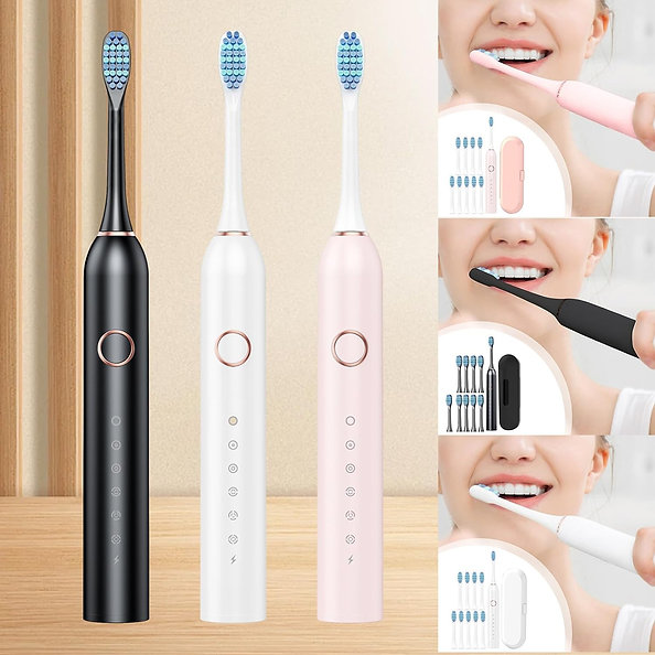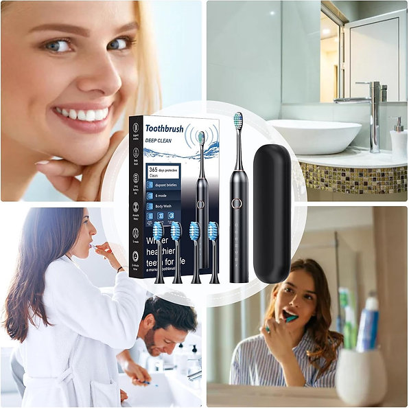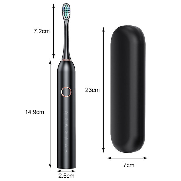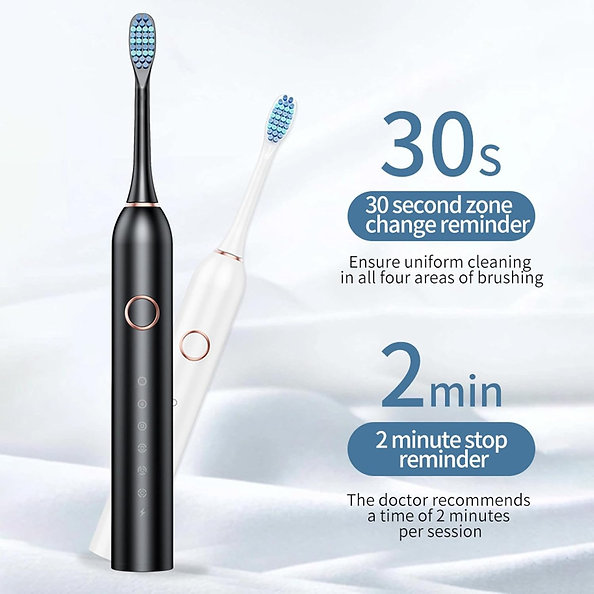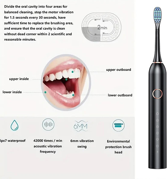 - 6 Arbetsläge: Rengöringsläge/Mjukt läge/Vitningsläge/Gingivalvård/Massageläge/Pulsläge