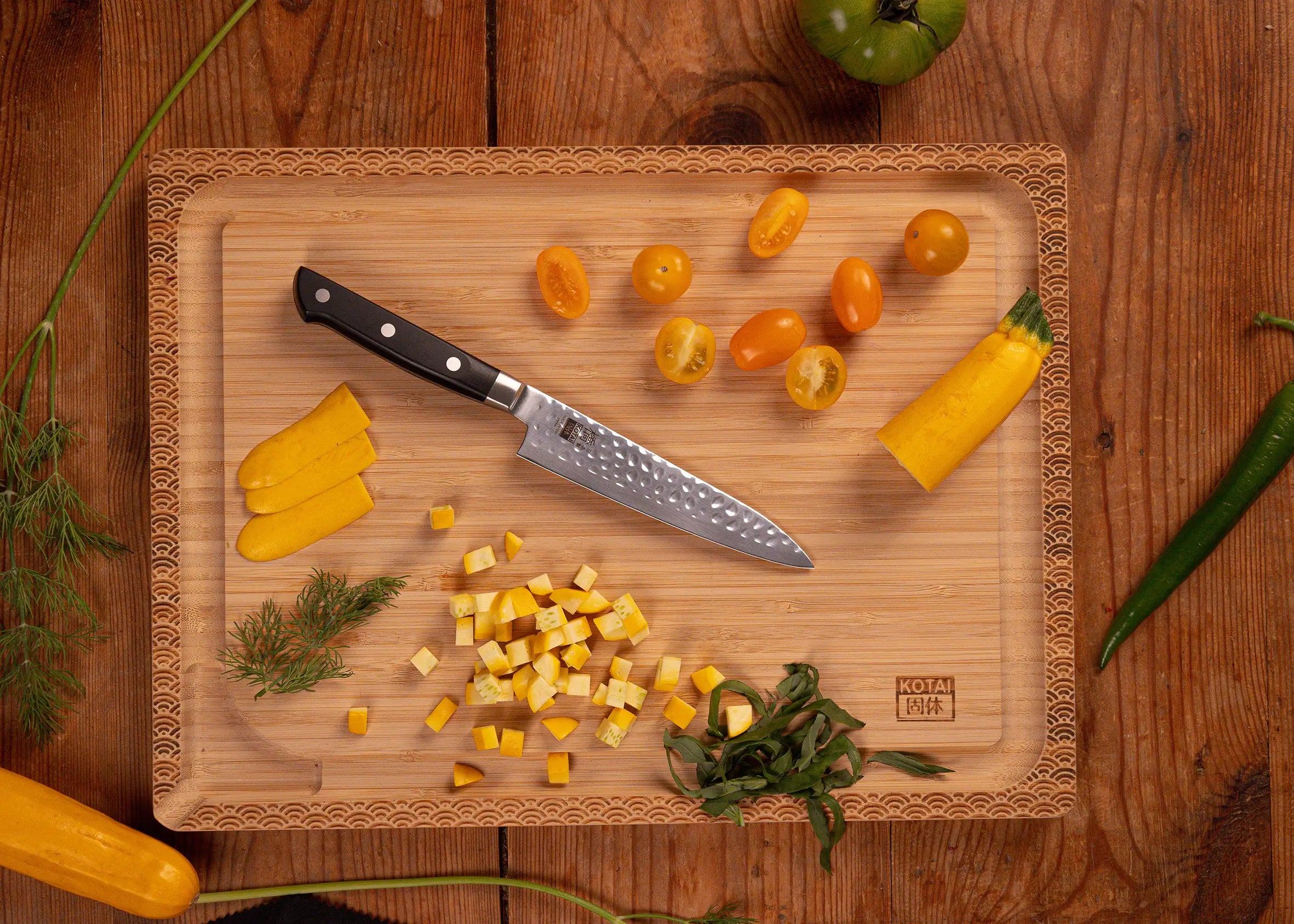 Utöver det estetiska tilldragningskraften skapar "Tsuchime" (槌目) hamrandet av bladet små luftfickor mellan bladet och matskivorna.