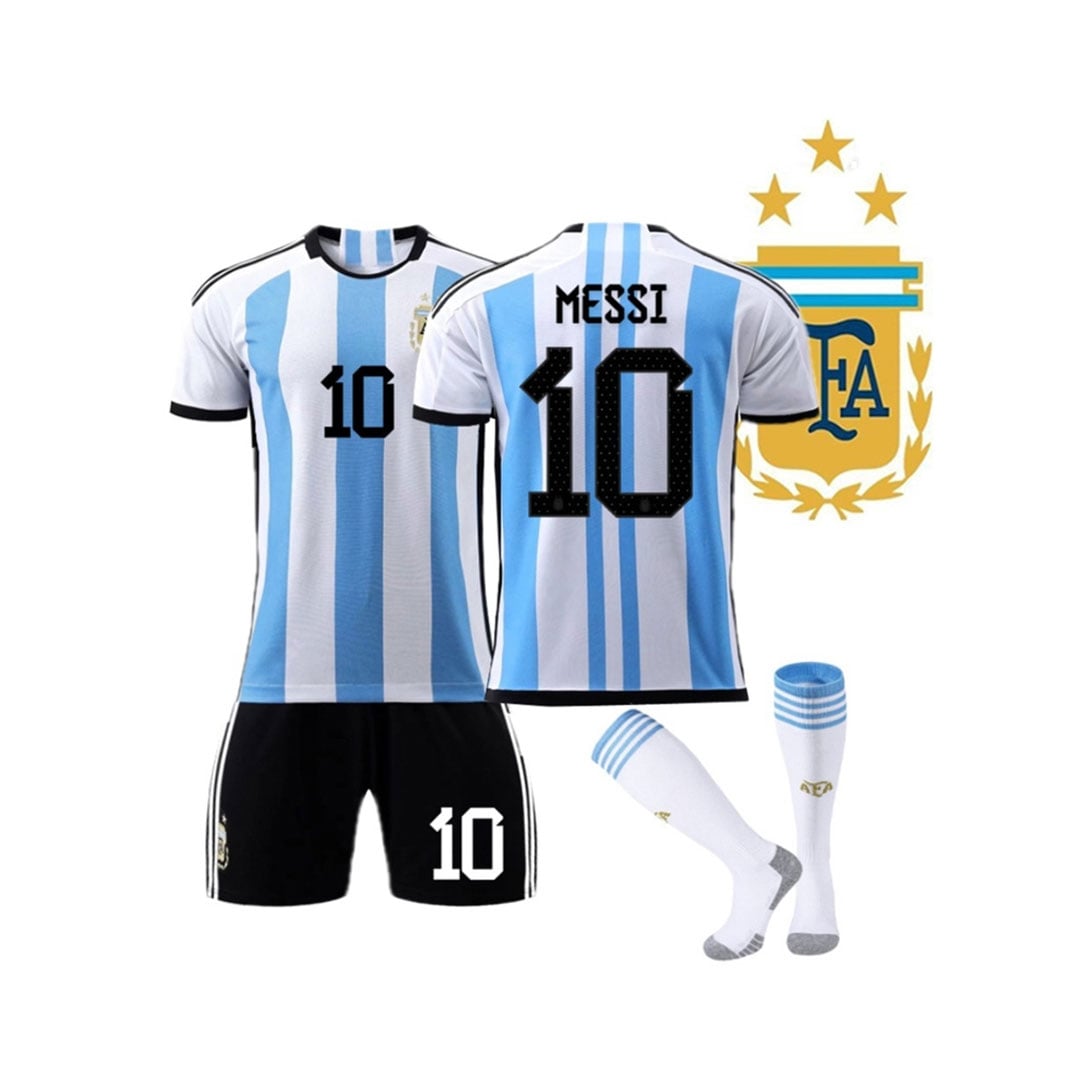 Blåvit fotbollströja, fotbollsshorts och strumpor med nummer 10 för barn och vuxna som gillar fotboll. Skön passform, tåligt material och en design som passar lika bra på planen som till vardags.