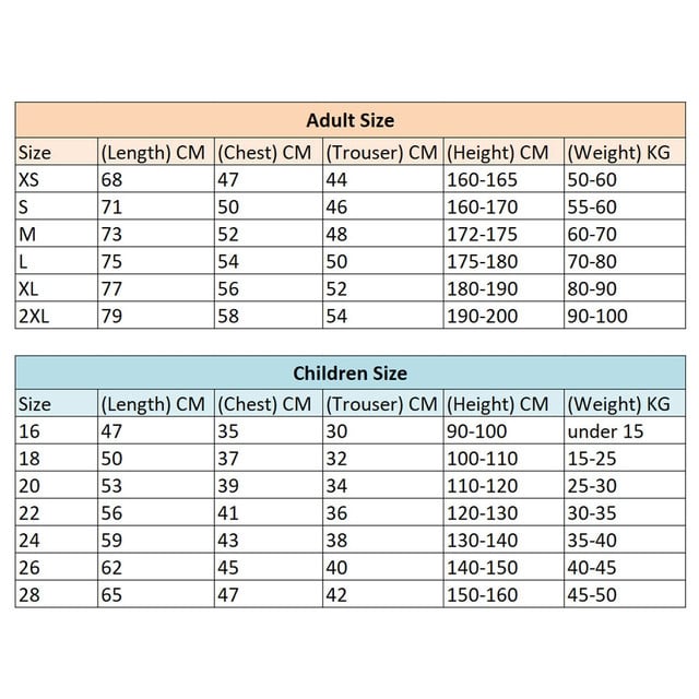 Storleksguide vuxen (längd tröja, bröst, längd shorts, rek. längd)