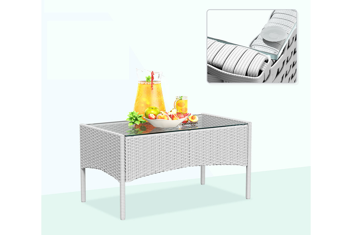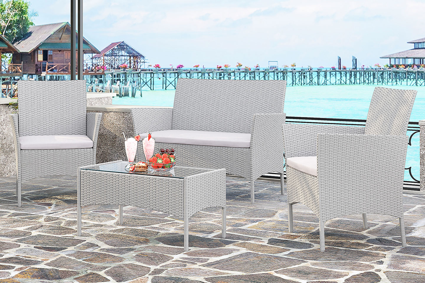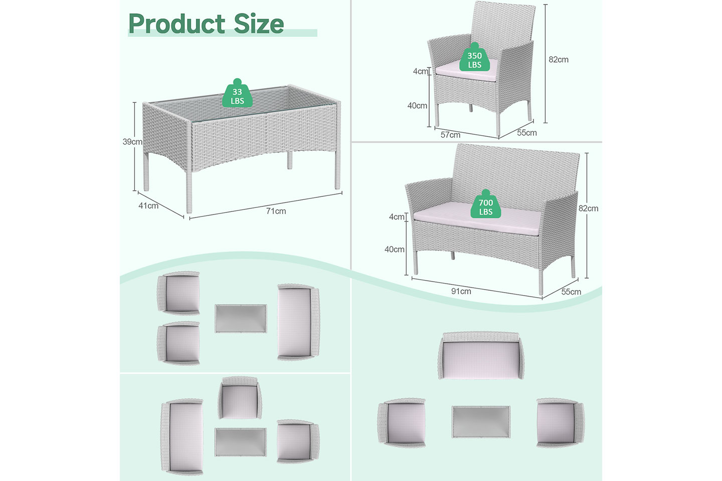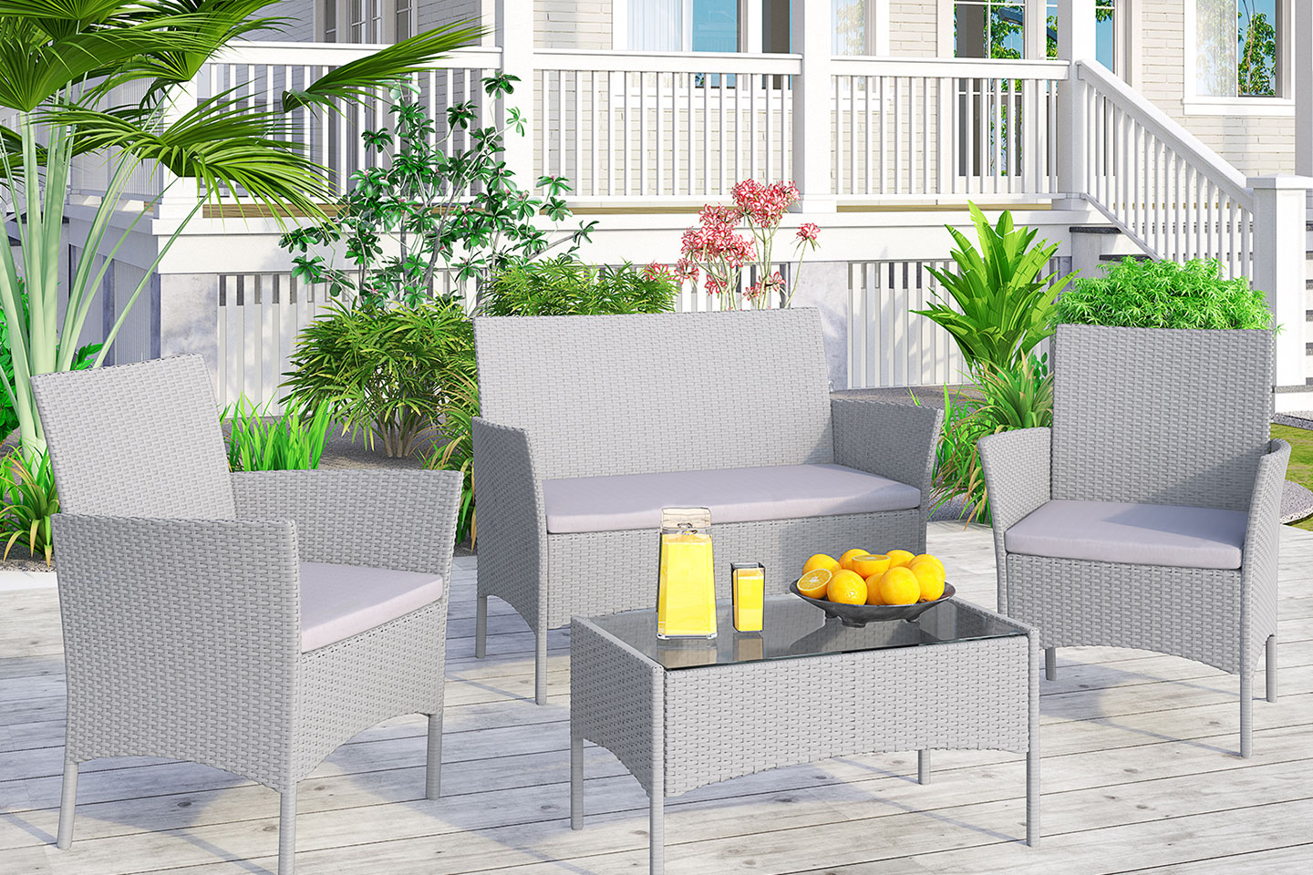 Detta set innehåller utemöbler med två fåtöljer, en 2-sits soffa och ett bord. Kan stå ute hela året.