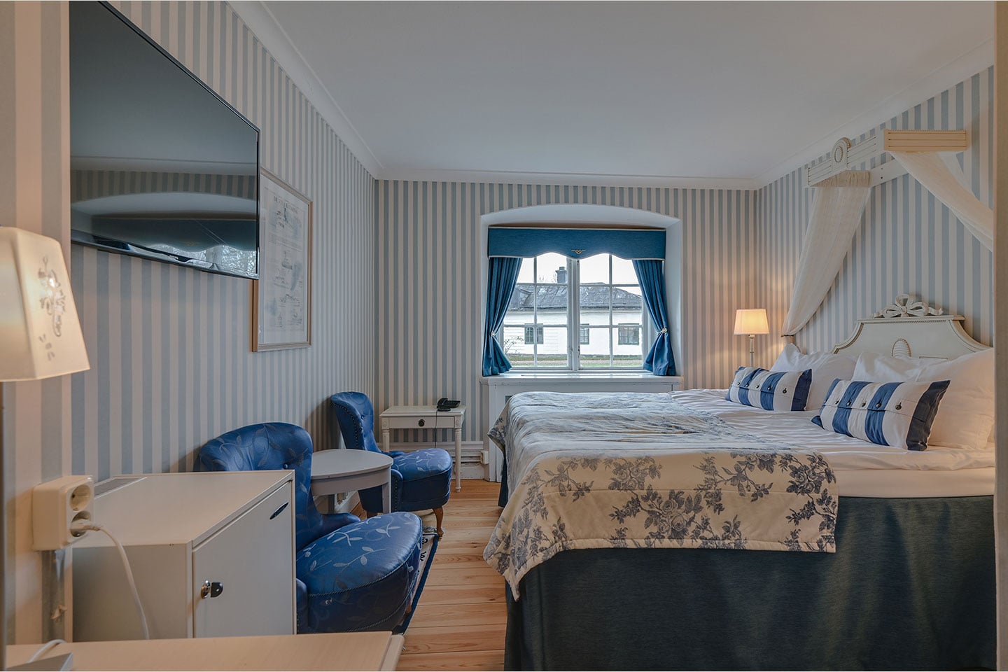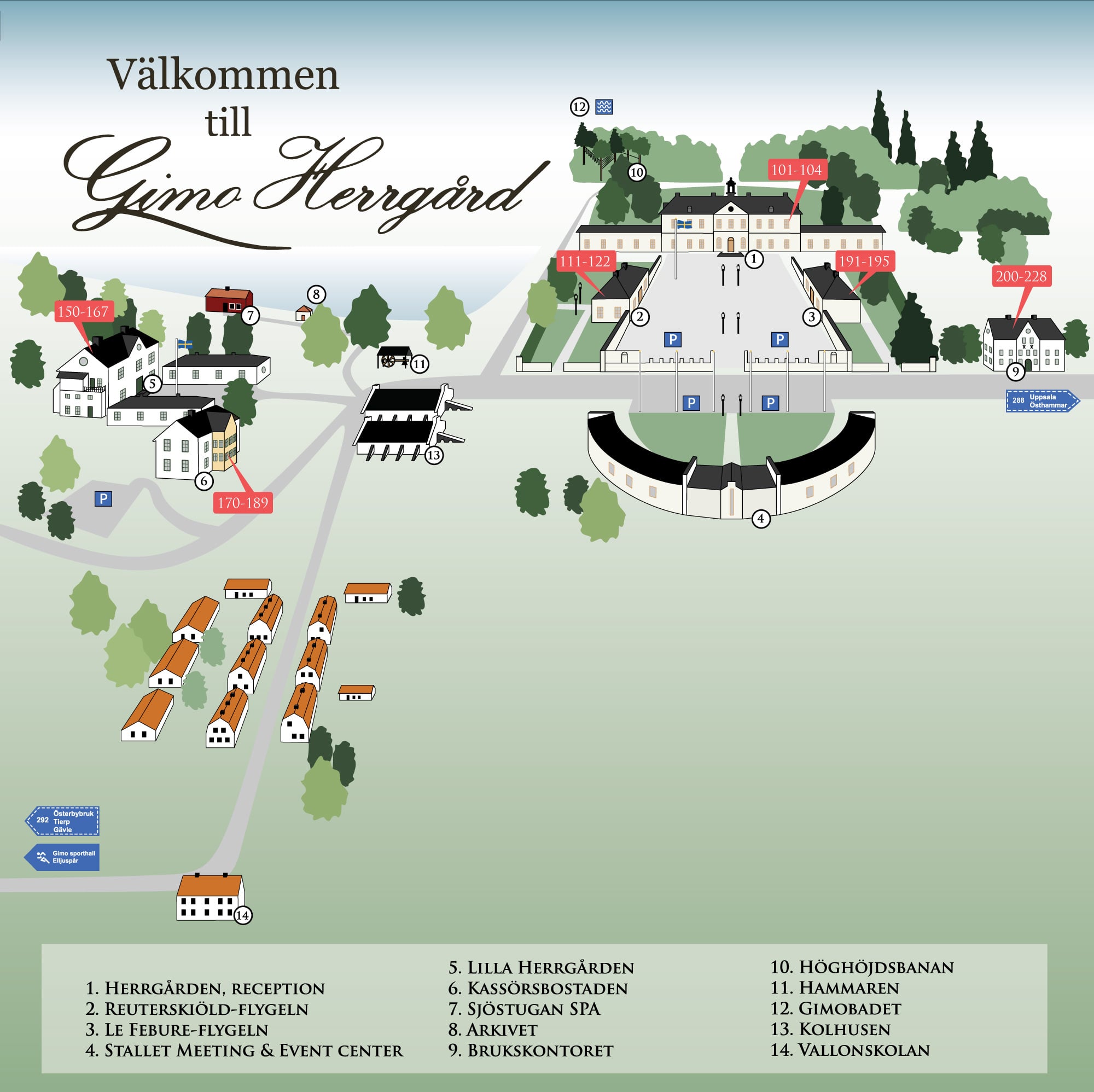Inbäddad i norduppländska skogar med den glimrande Gimosjön och vidsträckta ängar inpå knuten välkomnas ni till Sveriges första gustavianska herrgård. Gästrummen är fördelade i huvudbyggnaden med flyglar, i Kassörbostaden, i Lilla Herrgården samt i Brukskontoret. I huvudbyggnaden finner ni förutom receptionen även hotellets restaurang och 1700-talssalonger.