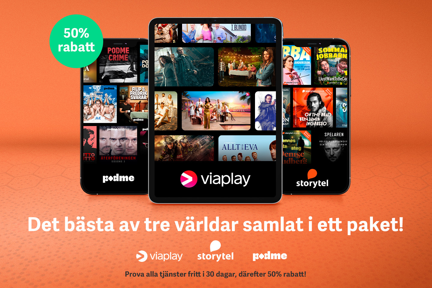 Upplev underhållning utan gränser med Viaplay, Storytel och Podme! Prova allt de har att erbjuda helt gratis i 30 dagar, utan reklam. Efter provperioden får du dessutom 50% rabatt på din prenumeration livet ut. Ta chansen att utforska nya filmer, serier och poddar utan kostnad och hitta dina nya favoriter!